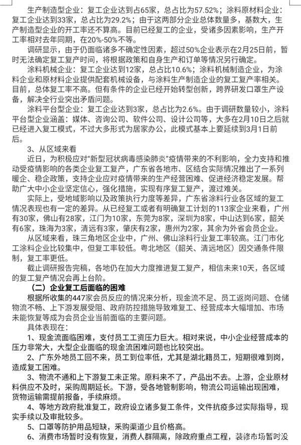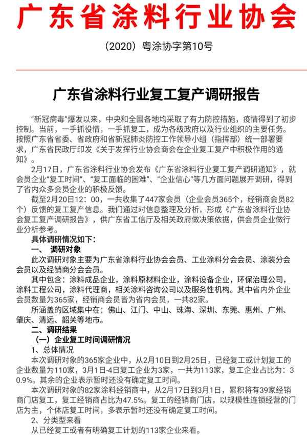 截至2月20日12:00,我們收集了447家會員(企業會員365個,經銷商會員82個)反饋的復工復產信息。我們通過對信息整理及分析,形成《廣東省涂料行業協會復工復產調研報告》,供廣東省工信廳及相關政府做決策依據,供會員企業做行業分析參考。