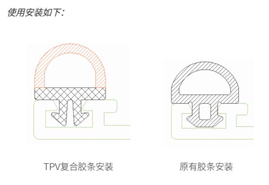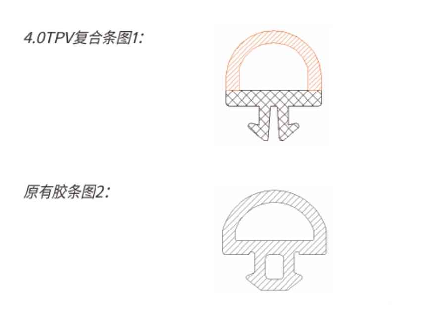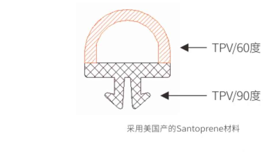 TPV復合膠條主要由TPV/60度與TPV/90度同時擠出拼接而成,TPV/90度為壓入型材槽口部分,TPV/60度為壓縮密封效果部分。