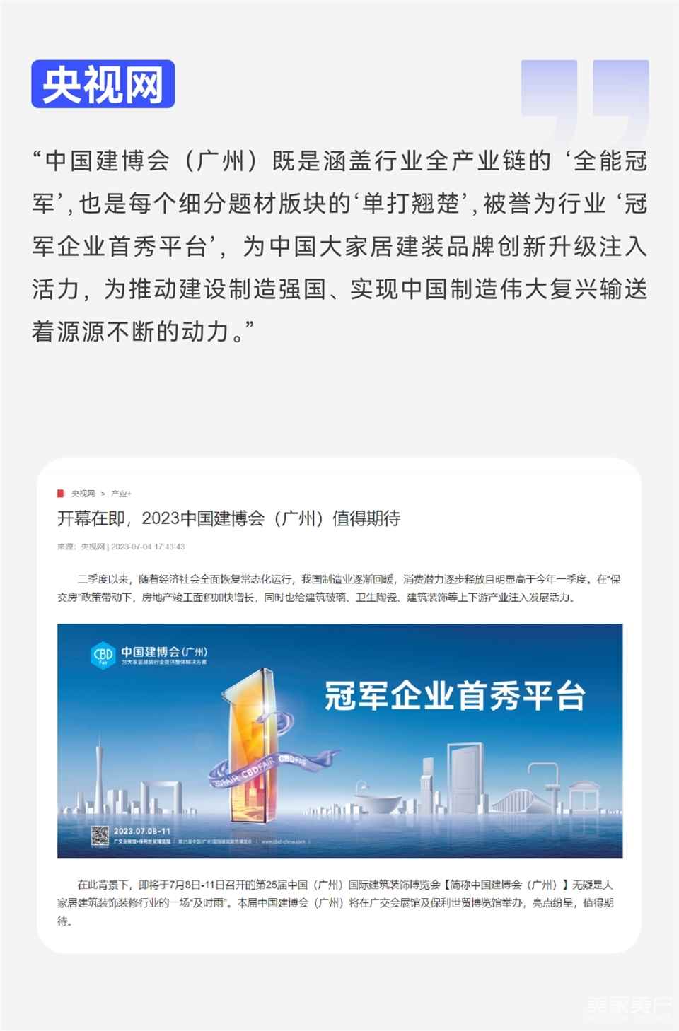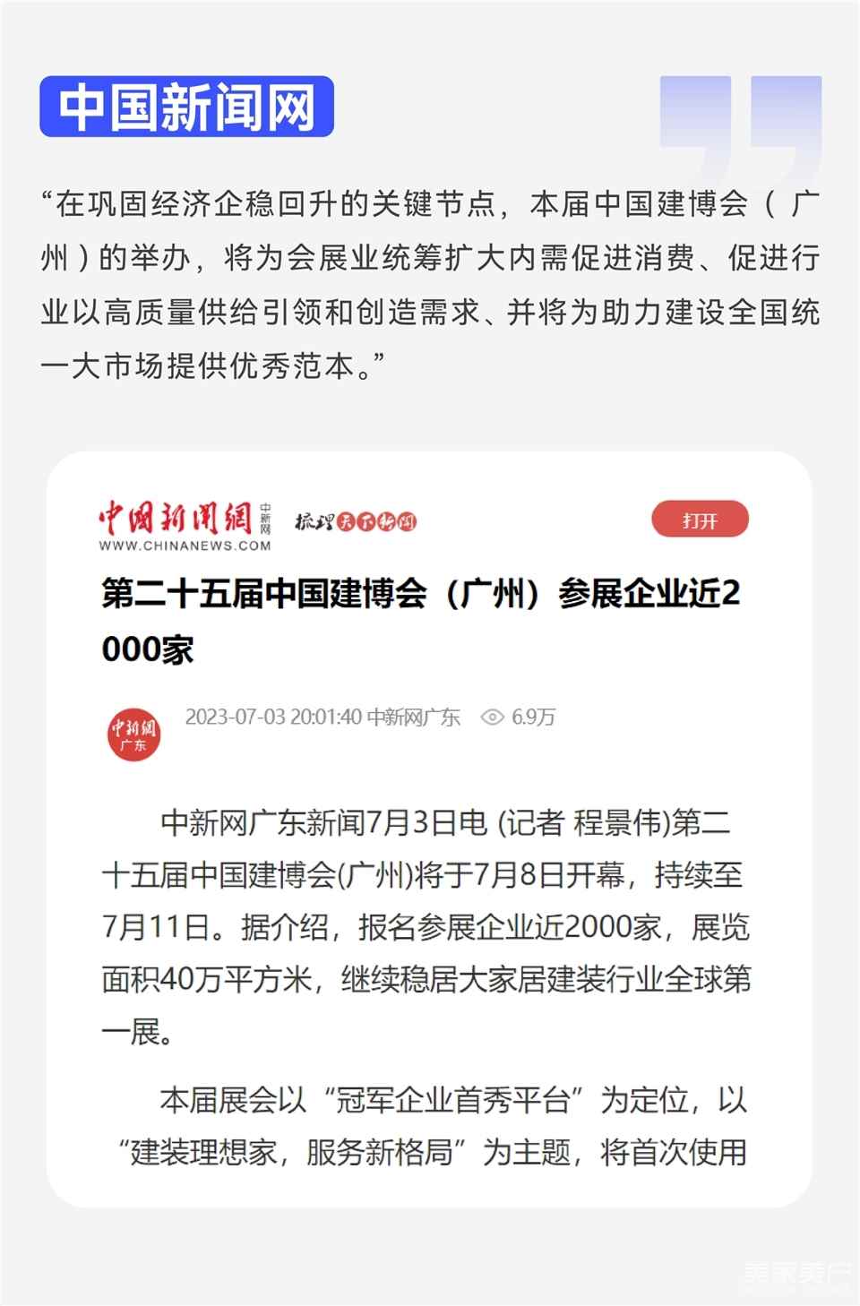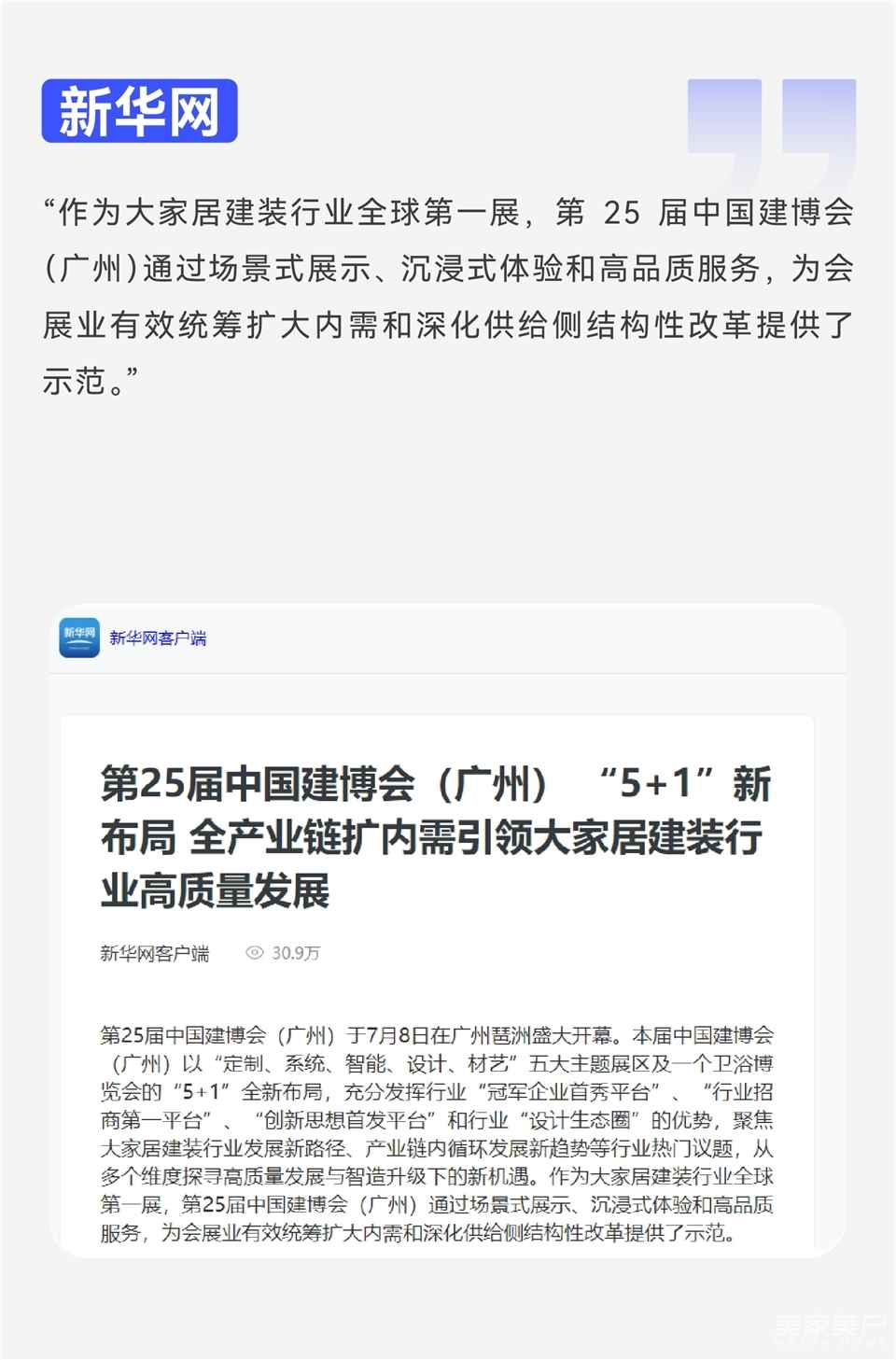 第25屆中國建博會(廣州)和首屆廣州衛博會積極響應6月29日國務院常務會議審議通過的《關于促進家居消費的若干措施》,持續深化展會主題,以更具創新性、前瞻性的突出特點,引領大家居建裝行業高質量發展。在我國經濟持續回升向好、全國各地加快高質量發展的關鍵節點,本屆展會的成功舉辦,全面呈現了大家居建裝行業強勁的復蘇態勢,起到了有效匯聚市場商機、提振市場信心、擴大市場消費的積極作用,并從促進行業創新發展有更大突破、促進行業協調發展有更大步伐、促進行業高質量發展有更大作為三個方面為行業新發展作出了新的貢獻。