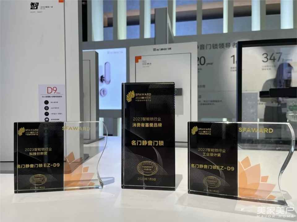 名門一舉包攬葵花獎:「2023智能鎖行業消費者喜愛品牌獎——名門靜音門鎖」、「2023智能鎖行業科技創新獎——名門靜音門鎖EZ-D9」、「2023智能鎖行業工業設計獎——名門靜音門鎖EZ-D9」三大重磅獎項!