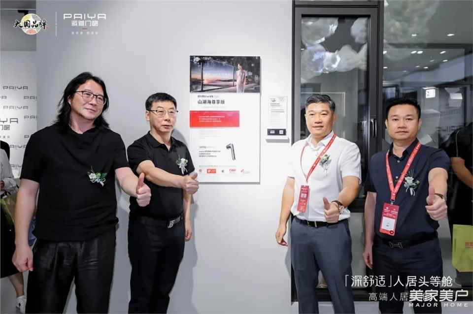 新品發布環節,廣東省家居業聯合會執行主席蔣德輝、派雅門窗董事長李鈞洪、副董事長李鈞海攜手派雅門窗品牌戰略顧問方棱聯合為派雅MS級山湖海尊享版進行新品揭幕。