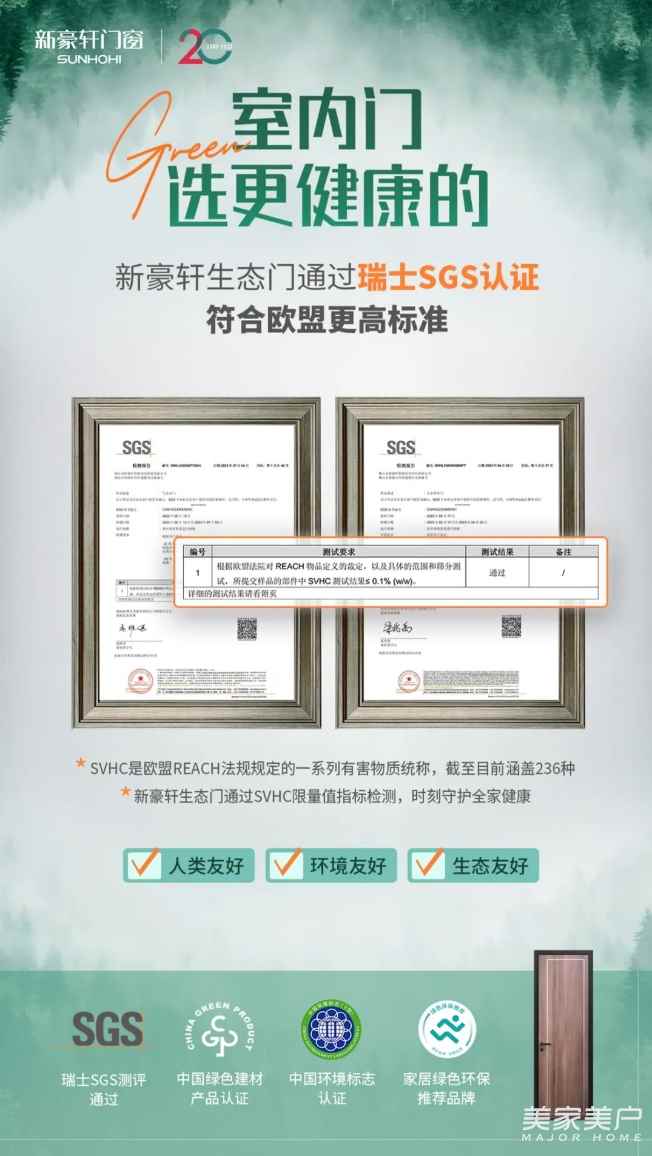 而通過瑞士SGS認證和中國綠色建材產品認證的新豪軒生態門,SVHC≤0.1%(w/w),以符合歐盟更高的標準,為消費者提供綠色、環保、健康的室內門,為打造綠色生態家園提供更多解決方案。