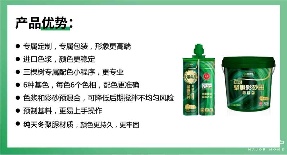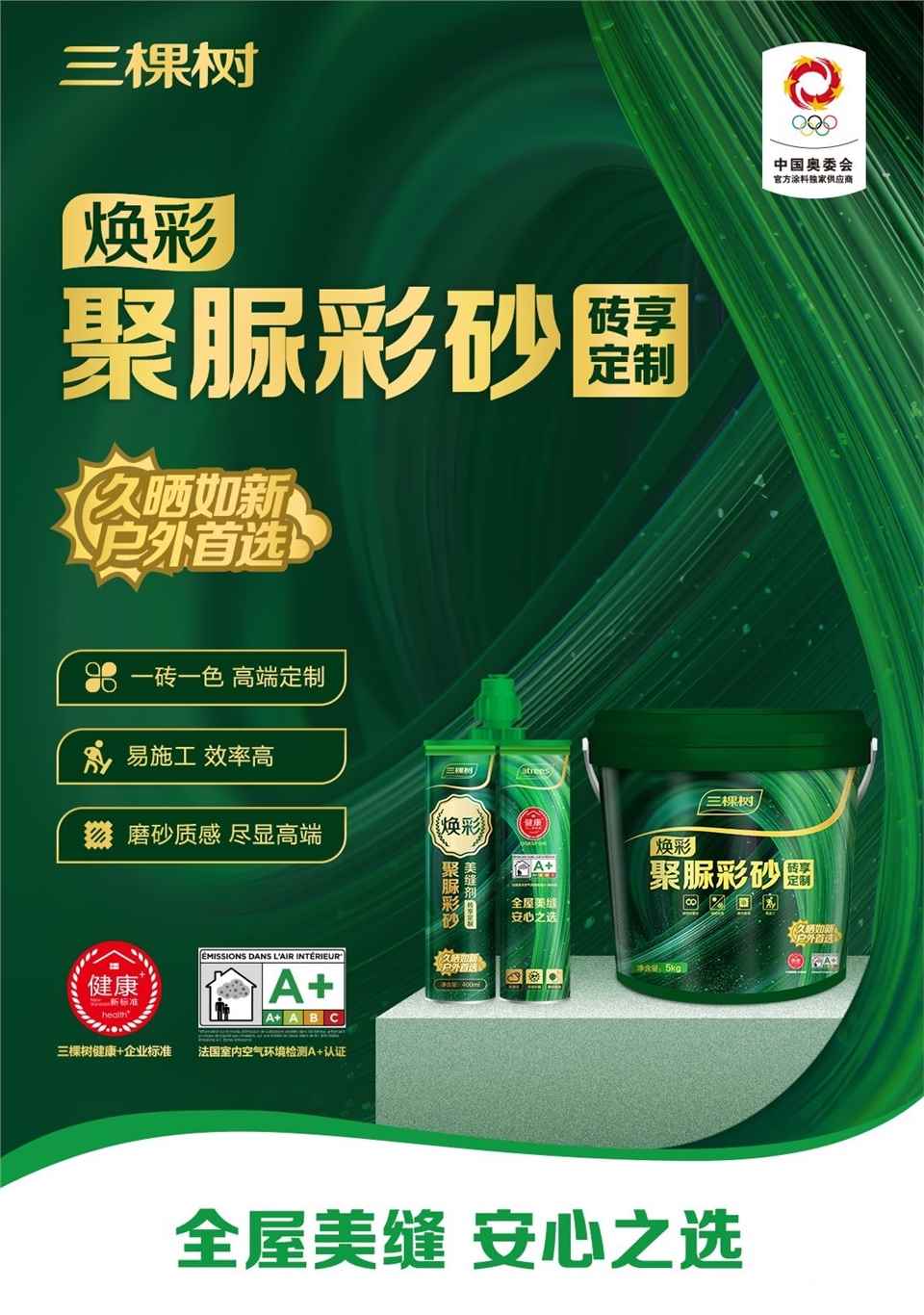 三棵樹始終堅持產品的環保標準,創造健康、綠色的居住環境。煥彩聚脲彩砂美縫劑新品通過健康+、法國A+標準,純天冬聚脲材料、安全環保又健康,為客戶健康生活提供堅實后盾。