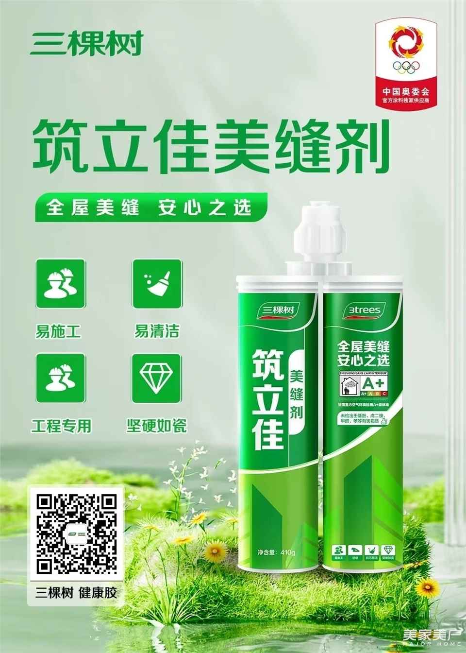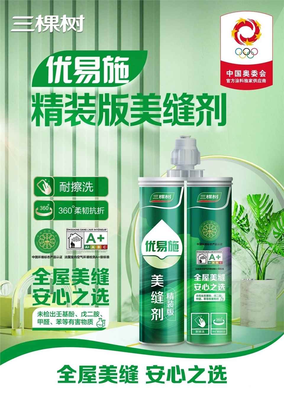 優易施精裝美縫劑新品通過綠色十環認證,法國A+,進一步證明其在室內空氣質量方面的優越表現。以實際行動向世界宣告,環保不僅是一種趨勢,更是三棵樹對未來的承諾。