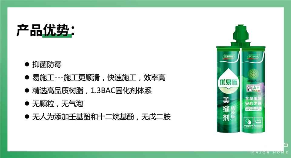 好膠就選三棵樹膠粘劑,贊14△點擊查看新品視頻除了環保認證,優易施精裝美縫劑自身的優越品質也是不容忽視的。它的精心配方和高質量原材料,確保了其出色的性能,為您的美縫任務提供了可靠的保障。