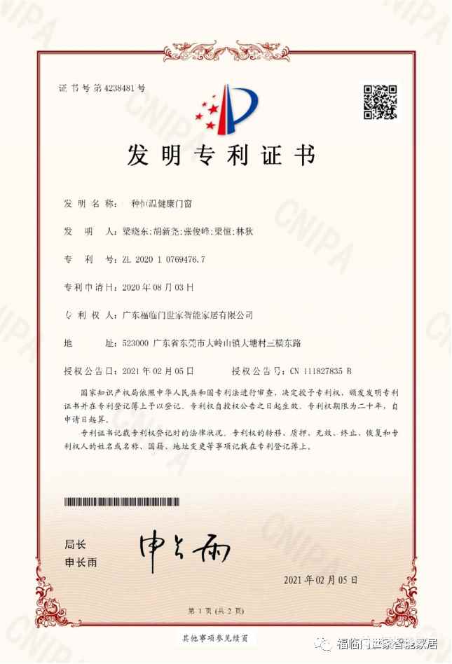 福臨門恒溫健康門窗在技術上的不斷創新與積累,走的就是國家大力倡導的“專精特新”之路。作為行業恒溫門窗發明者企業,福臨門恒溫門窗始終不遺余力地專注推進門窗恒溫技術的升級。目前福臨門世家總共有106項專利,其中發明專利有6項。