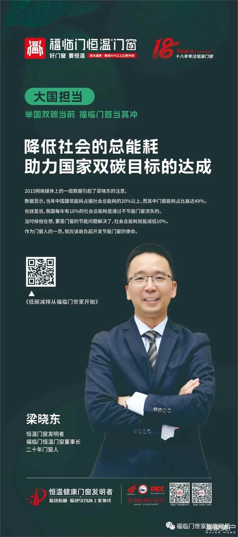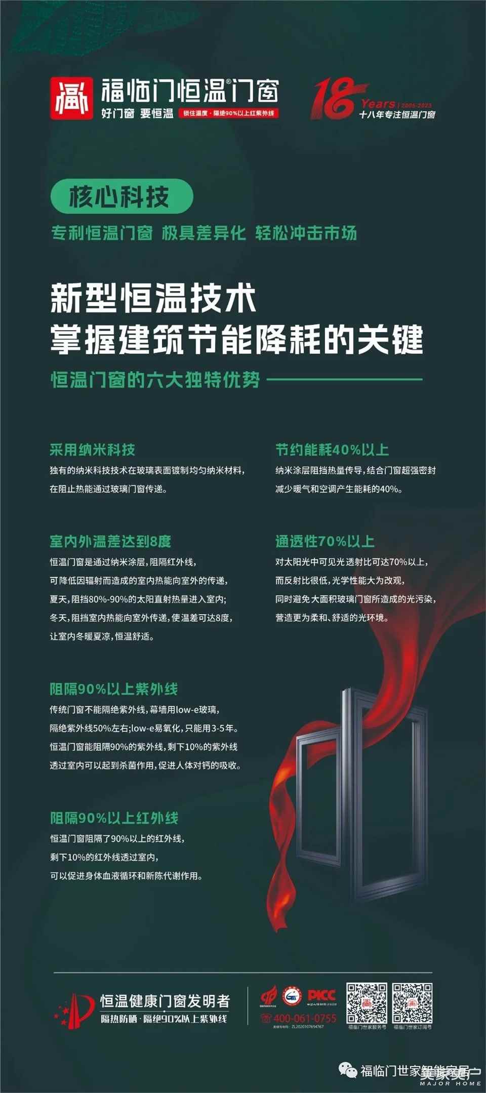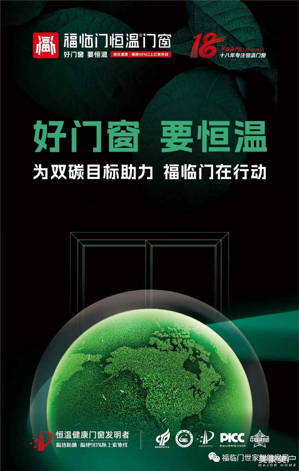 福臨門恒溫門窗符合習總書記的“兩山理論(金山銀山就是綠水青山)”,符合國家碳2030年達峰、2060年碳中和的國家大勢,是與國、與民、與消費者、與經銷商、與廠家,多方共贏的新賽道,是“功在當代,利在千秋”的可以為之奮斗終生的偉大事業!