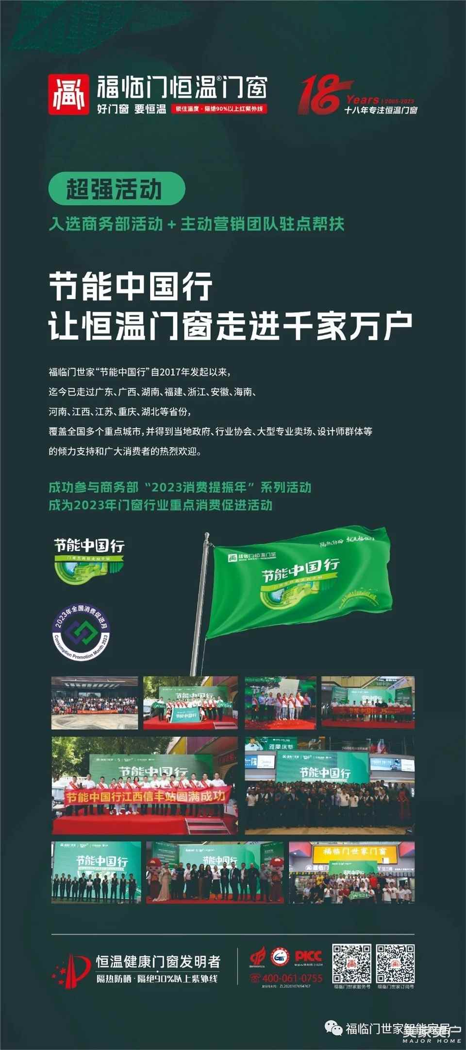福臨門恒溫門窗”節能中國行“,成功參與商務部”2023消費提振年“系列活動。福臨門恒溫門窗在激烈競爭的門窗紅海里面,開辟了一條全新的賽道,打造了門窗的新品類,差異化產品讓我們可以避開價格戰,讓競爭對手很難搶走我們的訂單。