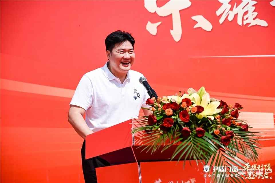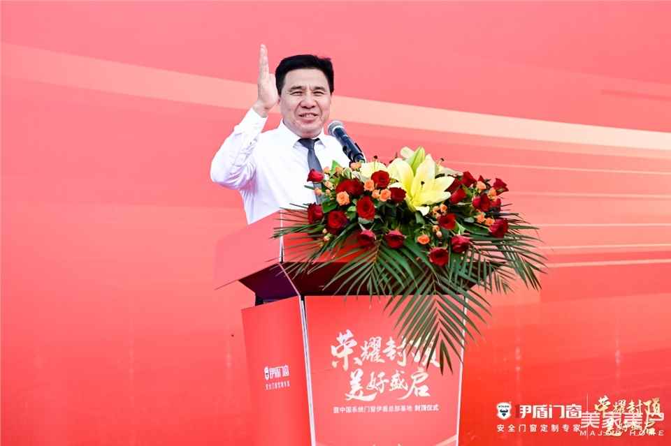 伊盾門窗董事長張龍偉在開場致辭中對政府領導及陪伴伊盾一路走來的經銷商表達了誠摯感謝,對施工人員表示了誠摯的慰問,回顧了伊盾門窗14年來取得的階段性成績,高度闡述了總部基地封頂的戰略價值及未來規劃。