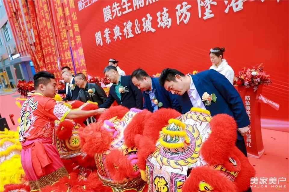 隨后,王總及與會嘉賓中國工程建設標準化協會建筑幕墻門窗專委會秘書長劉會濤;廣東省門業協會會長、派雅門窗董事長李鈞洪;廣東省門窗協會會長、億合門窗董事長曾奎;全聯房地產商會節能門窗分會執行會長潘慧玲;富軒門窗董事長李昌安;軒尼斯門窗副總裁余家優;老賴不賴門窗董事長賴世佑;一米陽光董事長錢竺林;美之選門窗董事長徐錦榮為體驗中心開業進行了隆重的剪彩儀式和點睛醒獅。