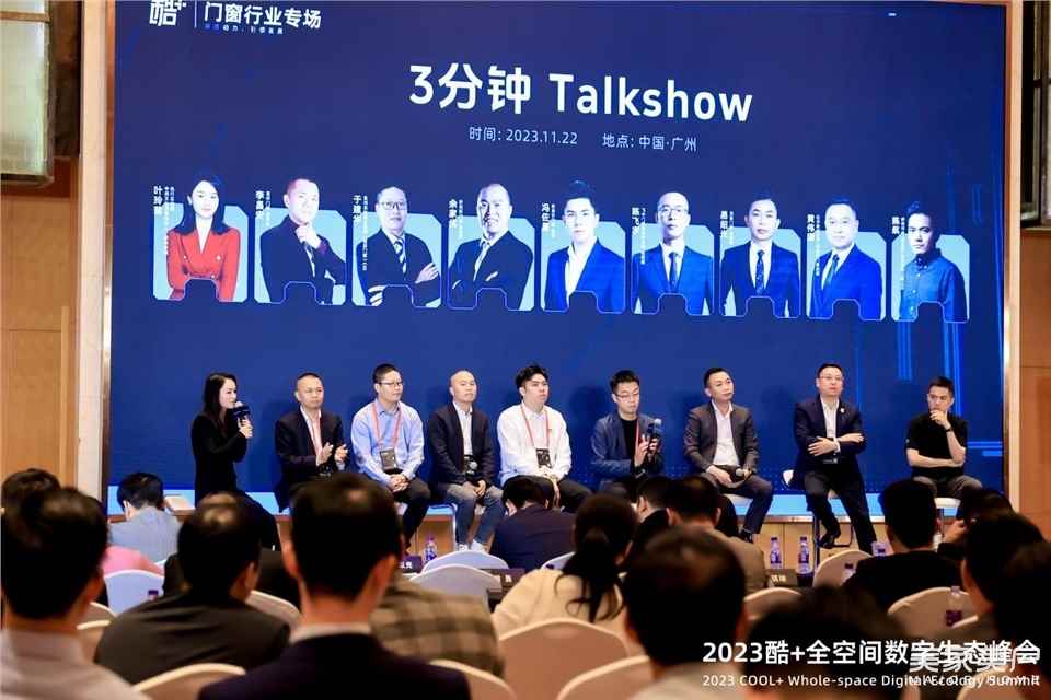 中居文化高級合伙人、新浪家居執行總經理葉玲菊、富軒門窗董事長李昌安、奧潤順達窗業集團(墨瑟門窗)CIO 于建華、軒尼斯門窗副總裁余家優、新豪軒門窗總裁馮佐星、飛宇門窗南部事業部總經理陳飛宇、派雅門窗總經理易紹光、億合集團董事/安柏瑞門窗總裁黃偉國與群核科技(酷家樂)聯合創始人兼CEO 陳航,在3分鐘Talkshow論壇環節,圍繞品牌建設、破圈發展、數字化轉型等話題,開展了一場別開生面的行業討論。