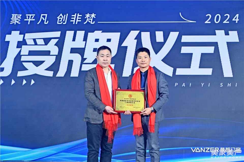 現(xiàn)場,中國建筑裝飾裝修材料協(xié)會門窗幕墻分會秘書長丁輝為梵哲門窗頒發(fā)了協(xié)會會員單位牌匾。梵哲門窗營銷總監(jiān)張小虎上臺接匾,授牌儀式的舉行,標(biāo)志著梵哲門窗邁入了國家級協(xié)會的行列。