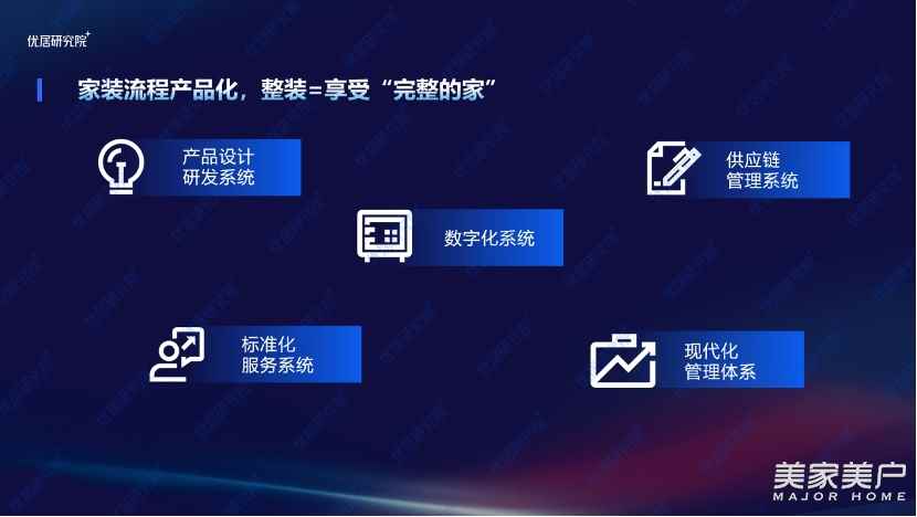 整裝的最大特點是家裝流程產品化,讓消費者買到一個“完整的家”產品,是主力消費群體的家裝模式“最優解”。整裝依托的是一個系統化、標準化的家裝服務體系,由以下五個系統構成——