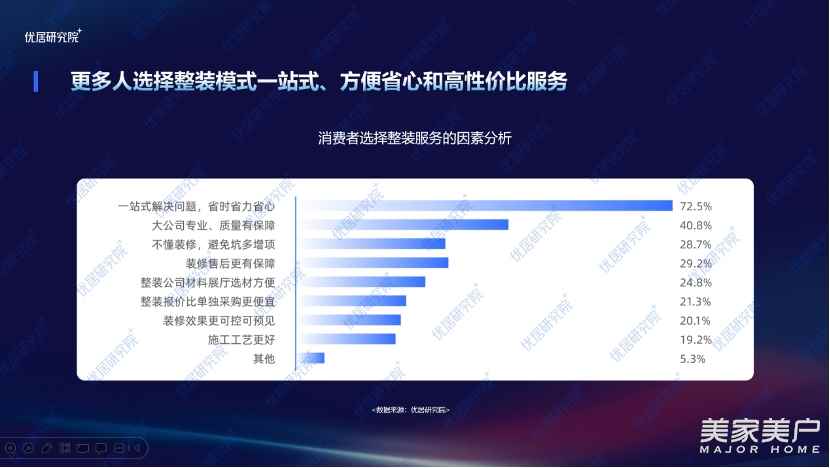 消費者選擇整裝最直接最根本的原因就是省心省力,這種裝修模式更符合當代人的生活選擇。整裝家裝為用戶帶來的一站式、專業化等服務相較于傳統家裝有更好更具優勢的裝修體驗。