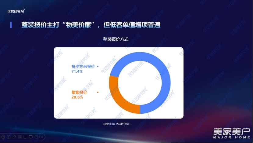 目前市場上整裝報價主要以平方米報價和整套報價形式,據調研數據,二者占比約為七三比例。主要賣點是性價比高,行業競爭還是以價格競爭為主,但隨著消費者對品質需求的提升,整裝公司要具備強交付能力、強供應鏈和高素質專業團隊,逐漸轉向標準化的高質價比。