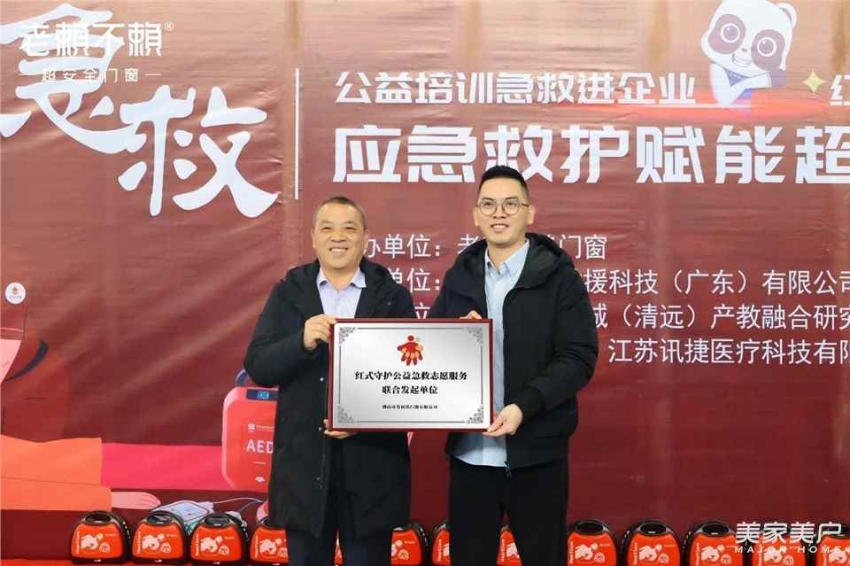 鷹鵬應急救援科技(廣東)有限公司總經理、紅式守護公益項目發起人莊嘉鵬為老賴不賴超安全門窗董事長賴世佑授牌“紅式守護公益急救志愿服務聯合發起單位”