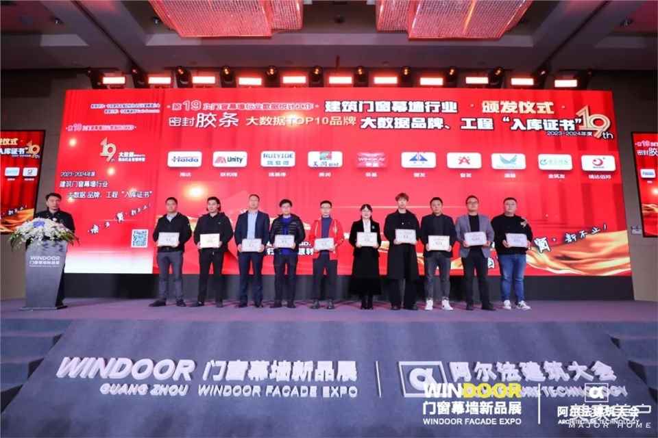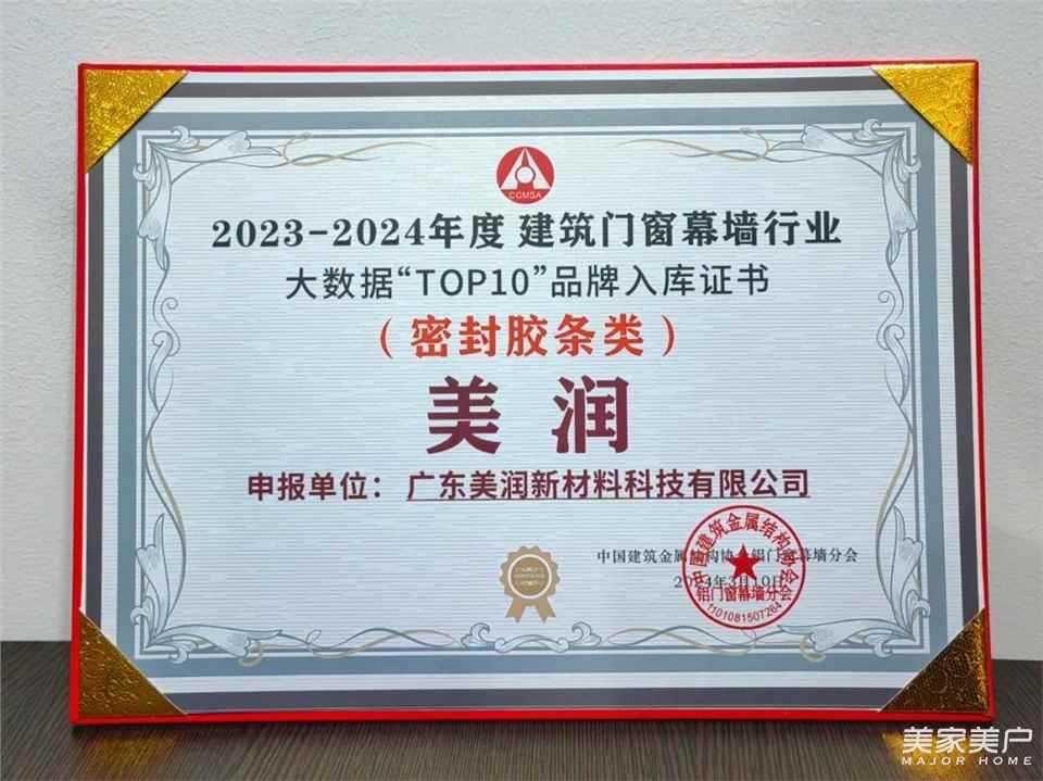 在本次全國鋁門窗幕墻行業年會上,由中國建筑金屬結構協會主辦的“門窗幕墻行業數據申報及統計工作”,基于“公平、公正、透明、科學”的原則。經過分會嚴謹評審,美潤新材憑借其產品在密封膠條領域的卓越表現,脫穎而出,頒發“2023-2024年度建筑門窗幕墻行業大數據‘TOP10’品牌入庫證書”(密封膠條類),并被授予“密封膠條類 十大首選品牌”的榮譽稱號,得到行業專家、客商、廣大用戶的高度認可和一致好評,彰顯了美潤新材在密封膠條領域的領先地位和品牌影響力。