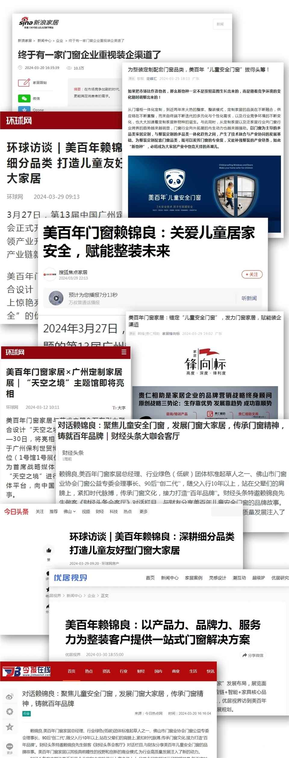 央媒代表環球網家居,財經頭條,行業媒體泛家居圈,美家美戶,主流門戶新浪家居、搜狐、騰訊,中華門窗網,網紅自媒體等多個媒體爭先報道,以媒體力量,傳播“天空之境”的設計初心,為未能來現場的用戶朋友們實現“云觀展”,讓更多用戶和商家了解到美百年“門窗定制+全鋁定制”的產品實力和“連鎖門店零售”+“整裝裝企渠道”的合作模式,助力“兒童安全門窗家居”可以通過更多元化渠道觸達用戶。