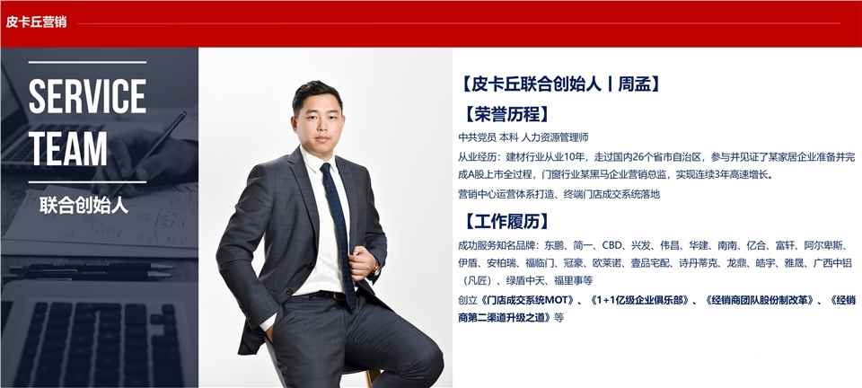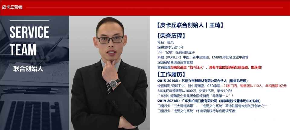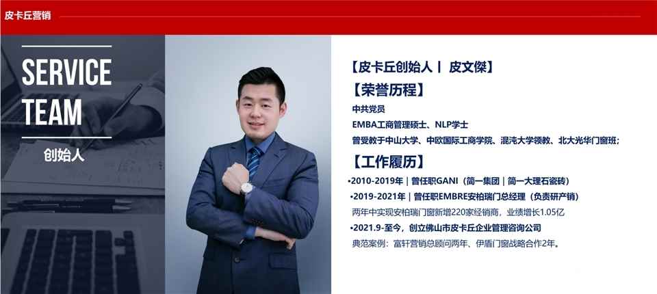 皮卡丘營銷作為門窗行業的領先營銷服務落地機構,擁有一支由15+余名高管團隊組成的精英團隊,具有豐富的實戰經驗和深厚的行業背景。多年來,皮卡丘營銷一直致力于為3000萬至10億規模的門窗企業提供全方位的營銷支持,已累計為35+家知名門窗企業,提供了卓有成效的營銷與落地服務。