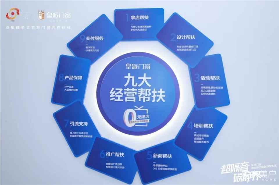 攜手亞奧,冠贏高端。為更好地吸引潛在客戶的加盟,此次廣州建博會,皇派門窗推出“0元建店”裝修支持,更是打破了定制行業重資產投入的模式,讓經銷商以低投入、輕資產、大市場、快回報的利好輕裝上陣,助力創業精英快速啟航、創造財富。