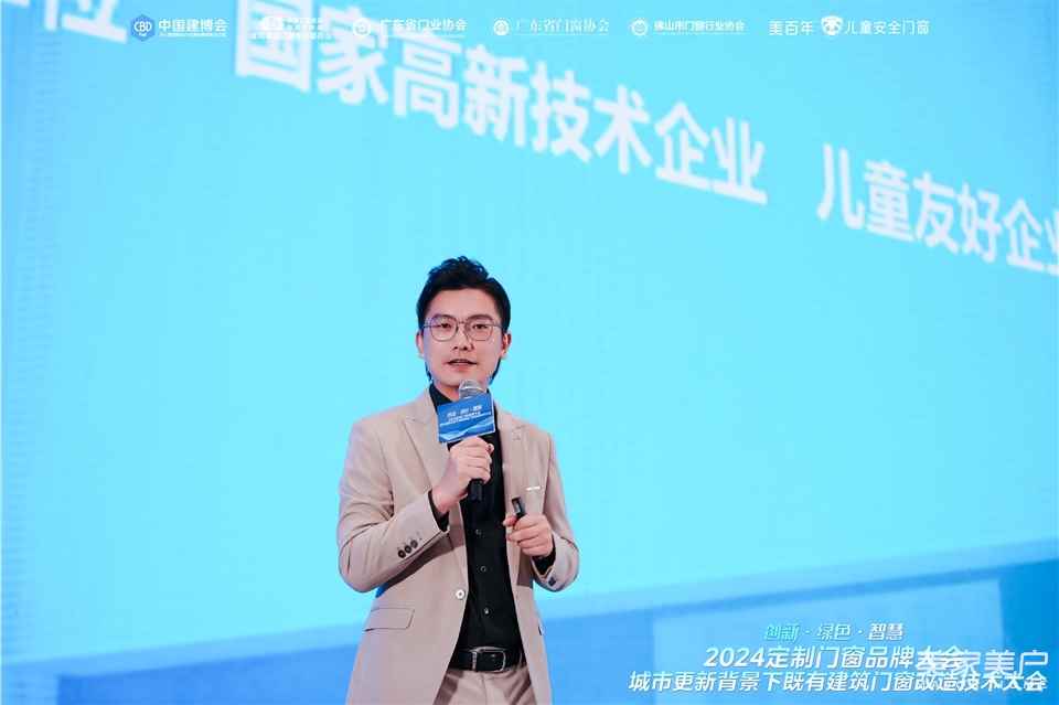 在專題演講環節,佛山市門窗行業協會門窗公益專委會理事長、美百年門窗家居總經理、門窗創二代抖音博主 賴錦良分享了老賴不賴門窗的品牌發展之路,并深度解讀了美百年推出兒童安全門窗、0醛鋁柜的原因。“從1997年創立至今,老賴不賴一直秉持誠信經營的理念,以‘安全’為核心,聚焦兒童安全門窗,持續推動門窗產品的品類創新、模式創新,致力于成為中國兒童家庭首選的‘門窗家居’品牌。”