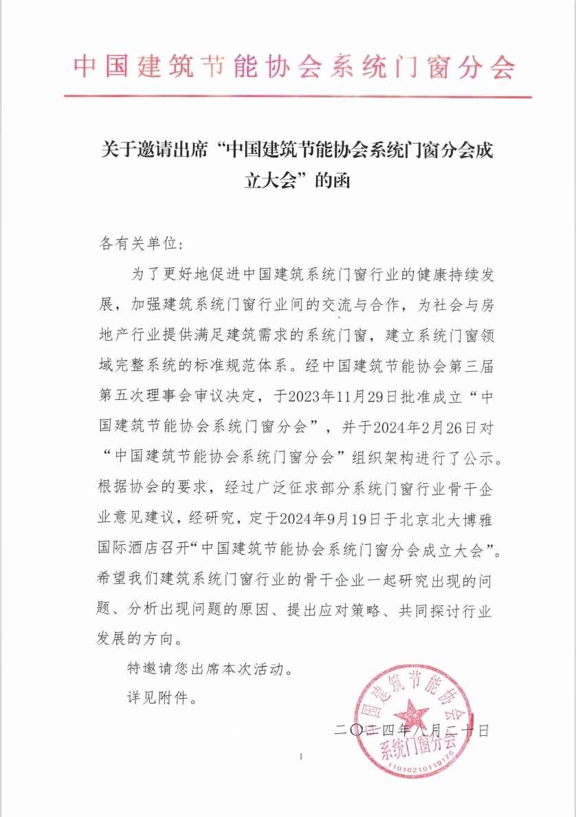 關于邀請出席“中國建筑節能協會系統門窗分會成立大會”的函