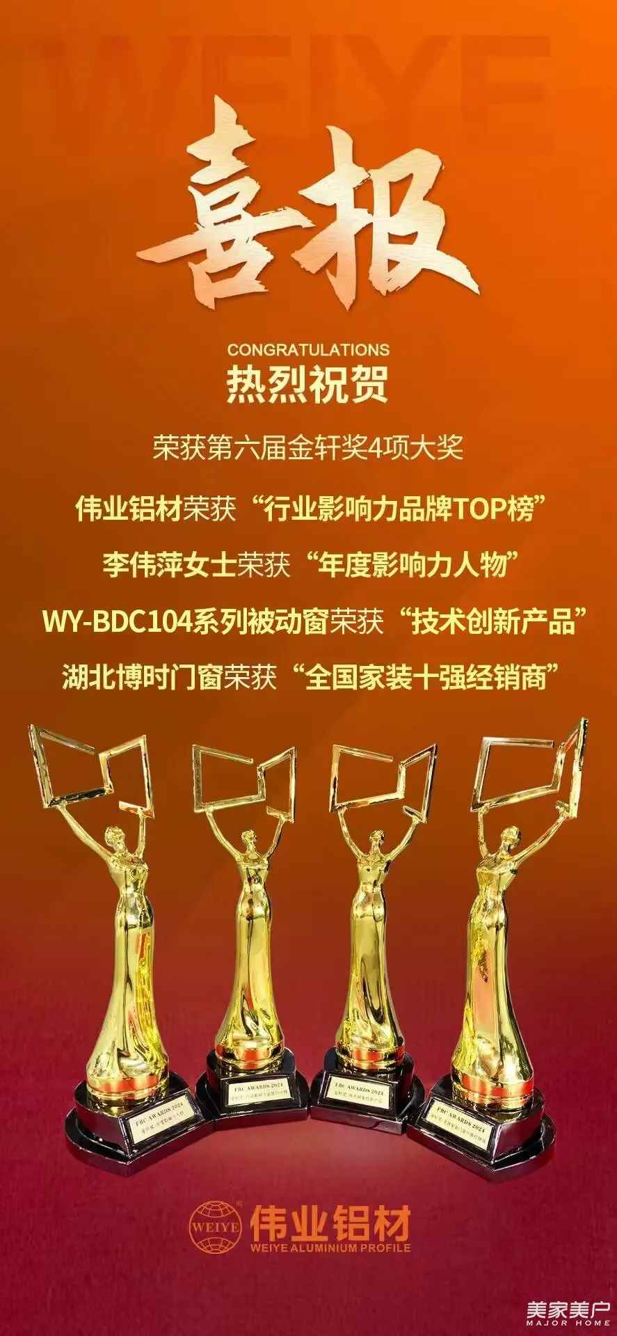 正是憑借出色的產品力,以及卓越的行業影響力,在有著門窗墻屆“奧斯卡”之稱的第六屆FBC金軒獎頒獎盛典上,偉業鋁材一舉攬獲“行業影響力品牌TOP榜”、“年度影響力人物”、“技術研發創新產品”以及“全國家裝門窗十強經銷商”四項重量級榮譽。為推動門窗幕墻行業的創新升級和高質量發展貢獻了非凡的偉業力量!