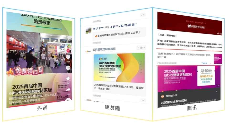 就 2025首屆武漢整裝定制家居展緊跟時(shí)代潮流,積極在抖音、騰訊等熱門平臺上進(jìn)行線上投放,建立數(shù)據(jù)標(biāo)簽,達(dá)到1億次宣傳曝光。