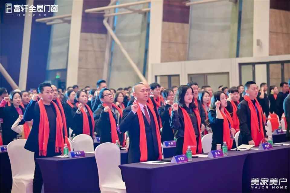 旌旗招展,誓啟新征。在峰會現場,富軒全屋門窗董事長李董和營銷中心總經理翁總帶領全國各大戰區負責人舉行了莊重的2025年度營銷中心授旗儀式和目標誓師儀式,在明確的新目標和洪亮的宣誓詞中團結奮進,充分展示了富軒鐵軍百折不撓、勇往直前的拼搏精神以及團隊精神。