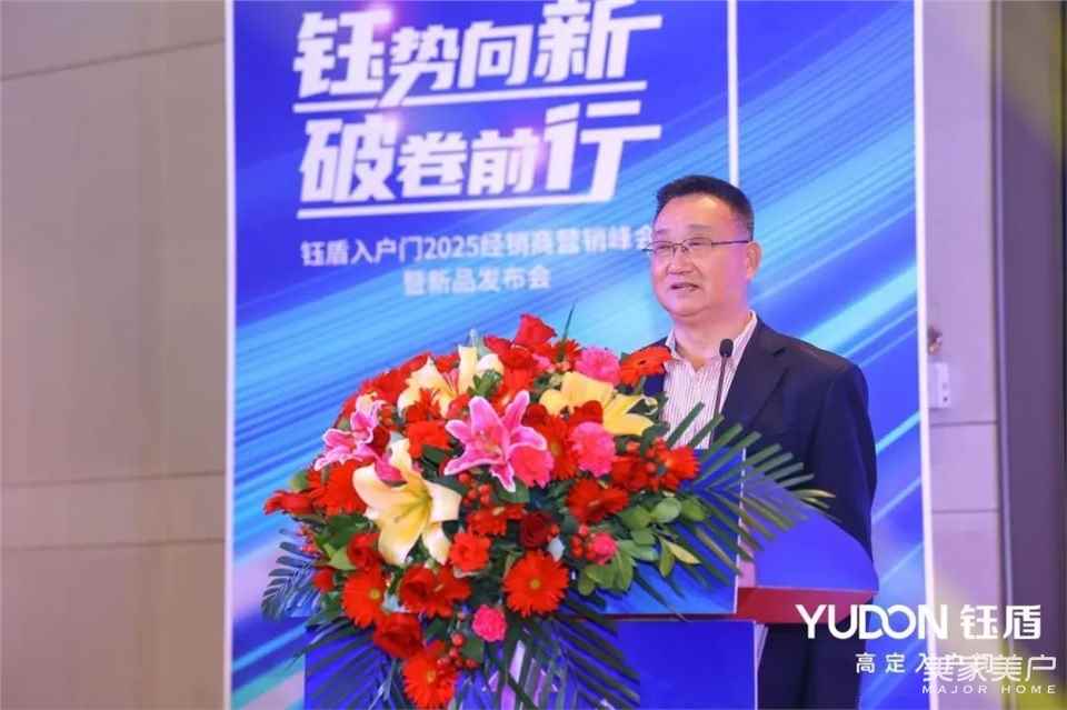 隨后,廣東省門業協會執行會長徐生發表致辭。他表示,盡管當前家居行業面臨挑戰,但2025年中國入戶門市場預計將迎來爆發式增長,行業發展前景廣闊。他對以鈺盾為代表的深耕入戶門行業的企業致以崇高敬意,并特別提到在賀董的帶領下,鈺盾始終緊跟市場趨勢,不斷提升產品競爭力。作為協會副會長單位,鈺盾注重品牌建設與產品創新,已成為廣東安全門行業的標桿企業。徐會長強調,鈺盾憑借對市場需求的精準把握和持續創新,未來必將走在全國入戶門行業前列,為行業發展樹立典范。