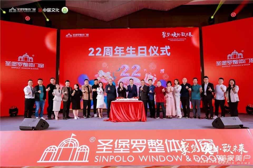 在22周年儀式上,邀請了多位重量級嘉賓上臺一起為圣堡羅慶生,包括有:紅星美凱龍門窗地板事業部總經理王一瑞、廣東省門業協會執行會長徐生、佛山市家居產業聯合會副會長兼秘書長李國堯、中居文化高級合伙人葉玲菊、全聯家具裝飾業商會門窗專委會秘書長鄭珊珊、中國泛家居網紅聯盟主席劉學旦、貴仁相助戰略營銷咨詢創始人韓鋒、廣東省定制家居協會副秘書長楊金勝、定峰匯創始人楊峰、門窗類頭部博主(門窗朱哥)朱澤堃、一品堂創新營銷創始人李萬豪、宇宙光年文化傳媒創始人鮑丹、米米多MCN聯合創始人薛蓉、海惟傳媒華南副總經理李佩桐、賽道創意CEO黃新榮。