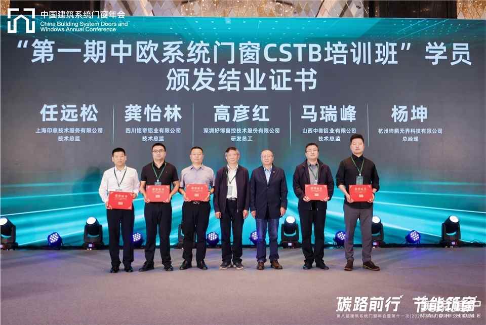全聯(lián)房地產(chǎn)商會(huì)副秘書長(zhǎng),寫字樓分會(huì)執(zhí)行會(huì)長(zhǎng)劉凱,中國建筑節(jié)能協(xié)會(huì)系統(tǒng)門窗分會(huì)顧問團(tuán)名譽(yù)組長(zhǎng)、系統(tǒng)門窗專家委員會(huì)名譽(yù)主任、上海市建筑五金門窗行業(yè)協(xié)會(huì)常務(wù)副會(huì)長(zhǎng)兼秘書長(zhǎng)錢經(jīng)緯上臺(tái)為上海印意技術(shù)服務(wù)有限公司技術(shù)總監(jiān)任遠(yuǎn)松、四川銘帝鋁業(yè)有限公司技術(shù)總監(jiān)龔怡林,深圳好博窗控技術(shù)股份有限公司研發(fā)總工高彥紅,山西中德鋁業(yè)有限公司技術(shù)總監(jiān)馬瑞峰,杭州坤鵬無界科技有限公司總經(jīng)理楊坤五位學(xué)員頒發(fā)了“CSTB系統(tǒng)門窗認(rèn)證培訓(xùn)一期結(jié)業(yè)證書”。