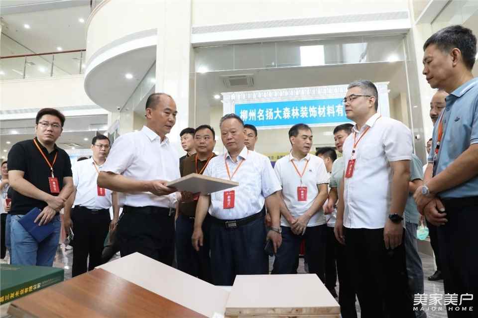 6月29日,在首屆柳州(融安)香杉板材訂貨會現場,柳州市人民政府黨組成員袁東升(中)參觀展廳。(覃嘉鑫 攝)