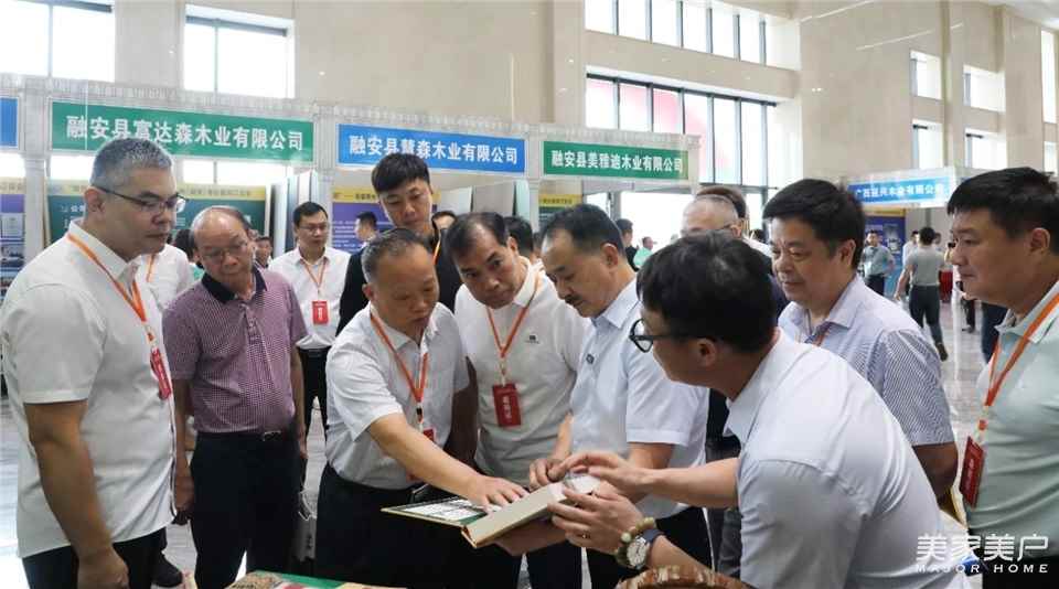 6月29日拍攝的首屆柳州(融安)香杉板材訂貨會現場,領導和嘉賓參觀展廳。(覃嘉鑫 攝)