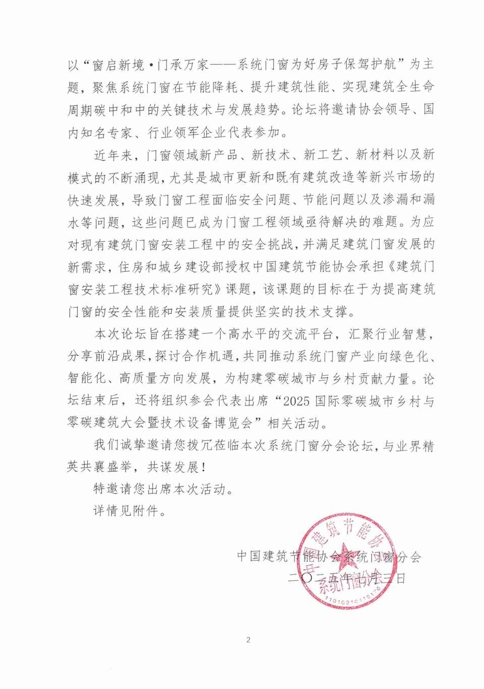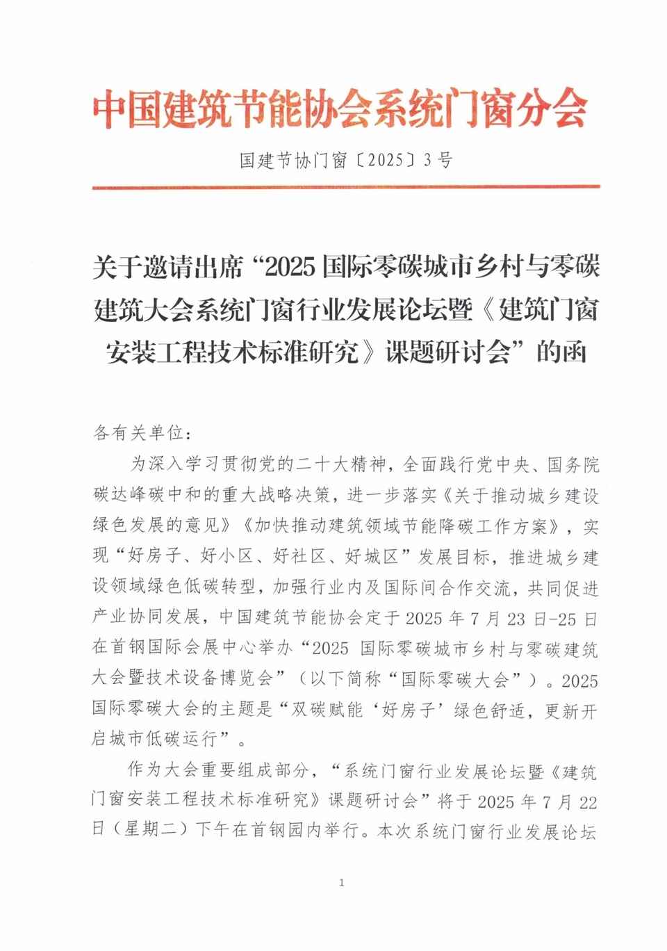關(guān)于邀請出席“2025國際零碳城市鄉(xiāng)村與零碳 建筑大會系統(tǒng)門窗行業(yè)發(fā)展論壇暨《建筑門窗 安裝工程技術(shù)標準研究》課題研討會”的函