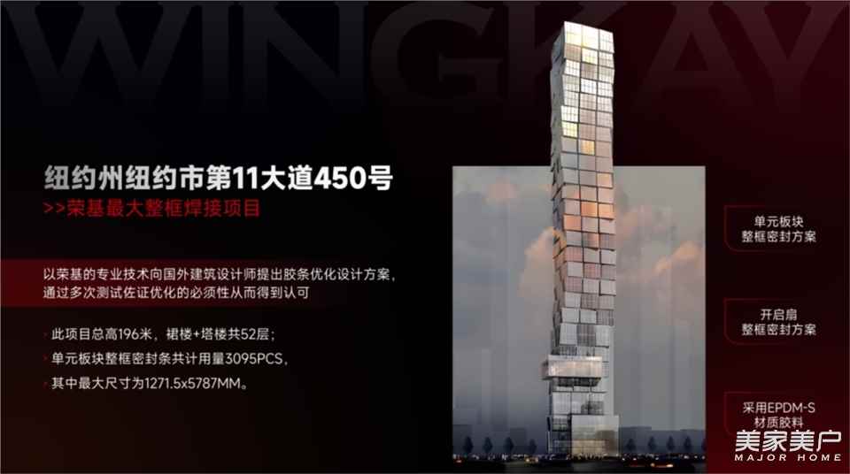 紐約州紐約市第 11 大道 450 號項目為榮基最大整框焊接項目。該項目總高196米,裙樓+塔樓共52層,單元板塊整框密封條共計用量 3095PCS,其中最大尺寸為1271.5x5787MM。榮基以專業技術,向國外建筑設計師提出膠條優化設計方案,通過多次測試佐證優化的必須性,得到項目方的認可。
