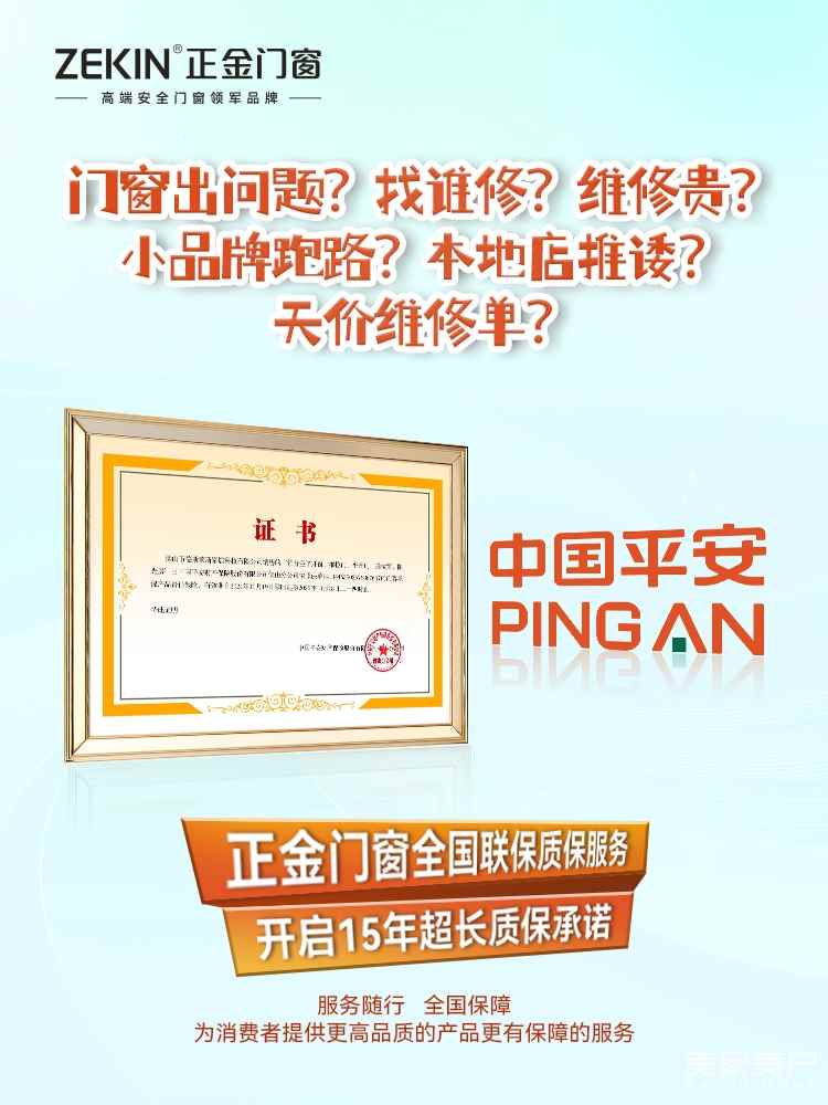 正金門窗《產品質量保證書》針對客戶最關心的保障問題,將產品用材、全國質保等統統寫入其中,??????無需擔心售后保障,放心裝上高端安全品質門窗。