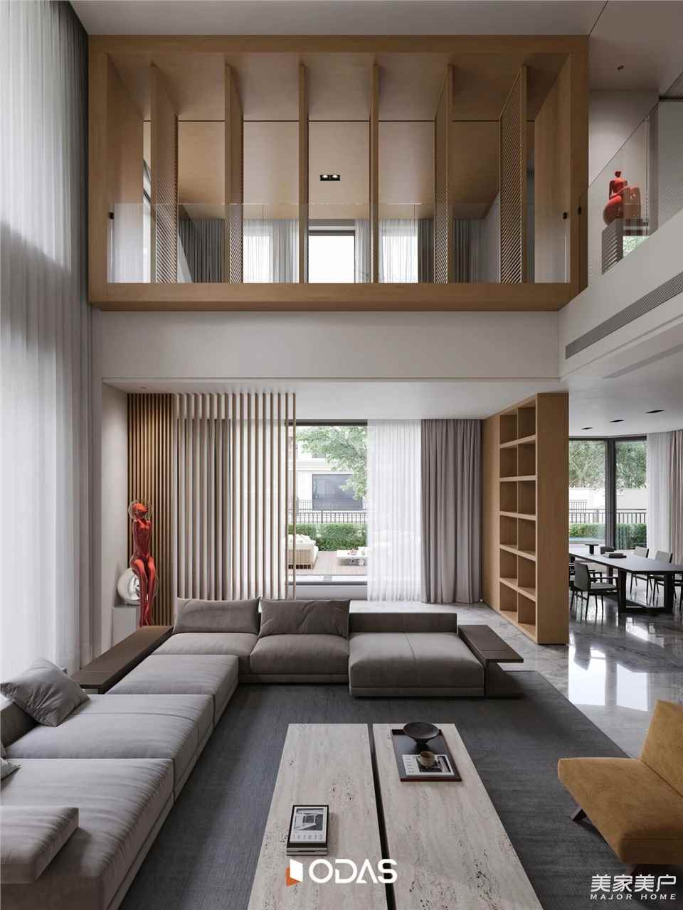 步入客廳,面向庭院的空間豁然開朗,溫暖明亮。二層固定玻璃投下的光影像琴鍵般彈奏出優(yōu)雅旋律,無論是家庭團(tuán)聚還是招待賓客,這里都溫柔包裹著回家的人。超大落地窗將室外景色“嵌”進(jìn)室內(nèi),讓空間成為風(fēng)景的延伸,讓自然持續(xù)參與家的塑造。