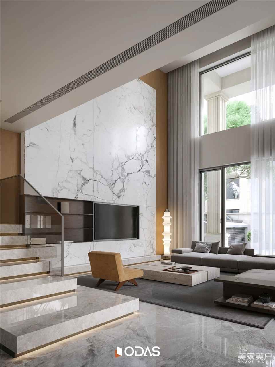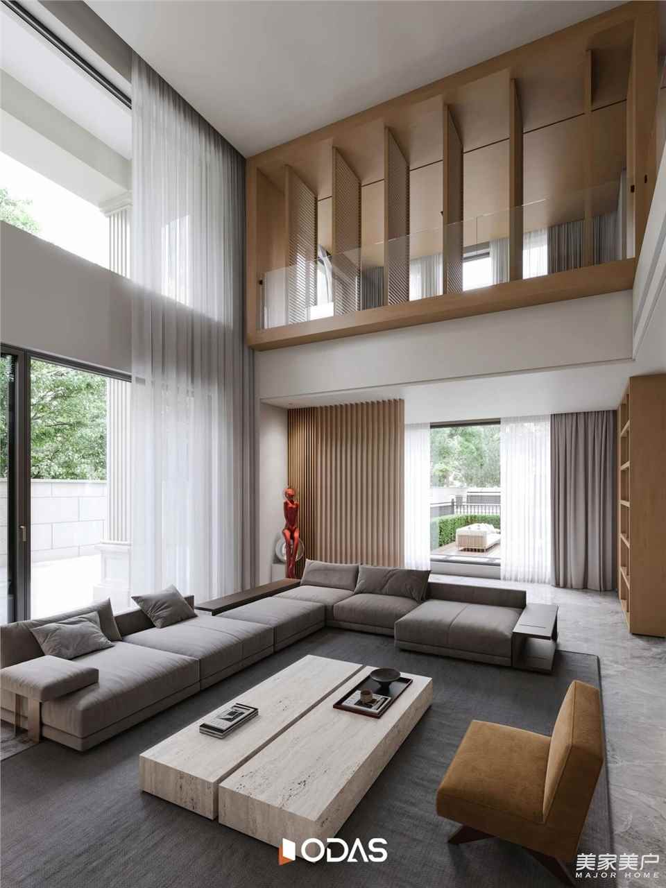 設(shè)計(jì)師認(rèn)為,空間是骨骼,硬軟裝則是內(nèi)在氣韻。為契合業(yè)主年輕個(gè)性化精神需求,整體布局以“平衡共生”為綱,材質(zhì)選擇透著對(duì)“自然”的敬畏,溫潤(rùn)洞石與木質(zhì)材料搭配,與門窗金屬材質(zhì)形成平衡對(duì)話。藝術(shù)茶幾、雕塑擺件等生活氣息物件有序分布,空間去除多余裝飾,回歸純粹休憩氛圍和靜謐感受,滿足業(yè)主功能與形式并存的需求。
