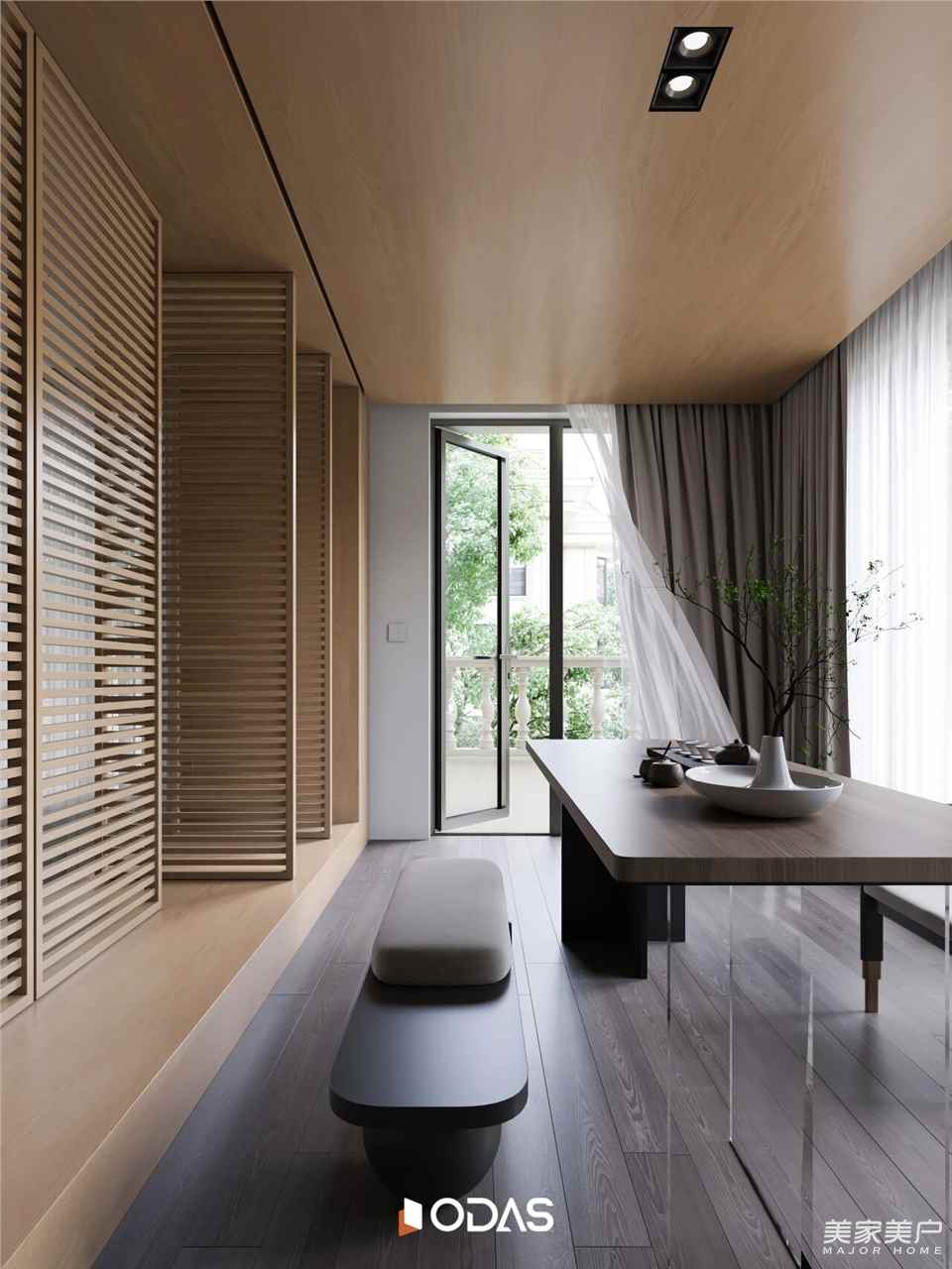 客廳采用格柵扇開合營(yíng)造秩序,富有設(shè)計(jì)感的落地?zé)粽宫F(xiàn)時(shí)間痕跡。傾瀉的光照滋養(yǎng)內(nèi)庭成為茶室背景,詩人筆下“茶煙裊裊籠禪榻,竹影蕭蕭掃徑苔”的畫面呼之欲出。理想的健康人居空間,是自然、藝術(shù)與生活的共謀。